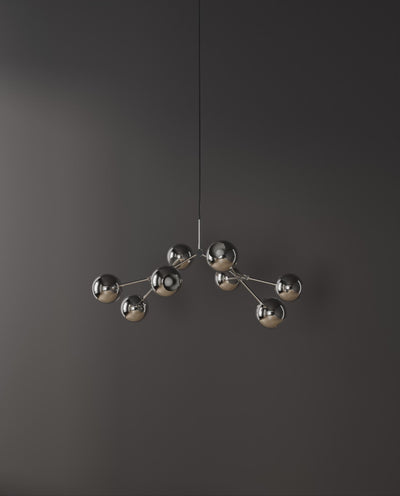 The Drop Chandelier Globe introduces a captivating twist to its iconic design with the introduction of a sleek, globe-shaped metal lampshade. Named after its lampshade, Drop Chandelier Globe is an ode to 80’s geometric designs, emphasizing clean lines and effortlessly melds with any interior decor.